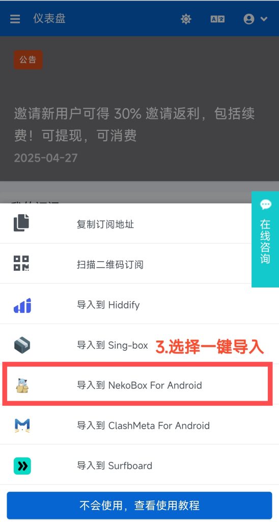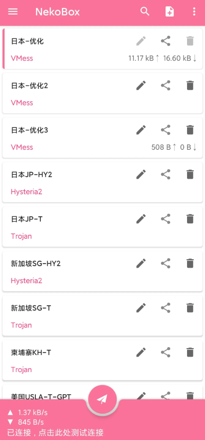 现在位置: 首页 / 默认 / 正文 「 Android 」NekoBox教程 SHMILY 默认 2025-03-07 343热度 0评论 NekoBox for Android下载地址:点击访问 至此,通过订阅地址方式添加节点代理服务器就成功了,如下图所示为成功连接状态,可以看到软件主界面最底部显示已连接,同时可以点击进行测速与检查连接状态。